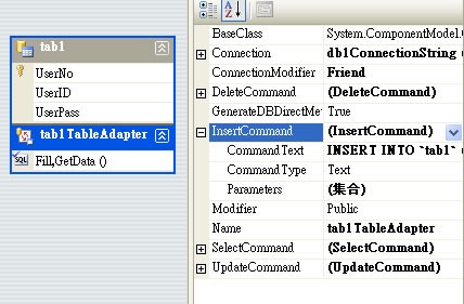 當資料庫連線建立之後TableAdapter會自動產生出來,且會自動把select、insert、update、delete等SQL語法建立起來,如果當程式對於datatable裡面的資料進行變動時,再呼叫TableAdapter.insert()、TableAdapter.update()...便可將資料回存到資料庫。