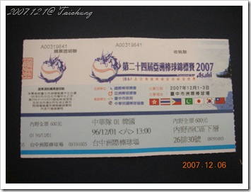 今年很多國際棒球賽在台灣舉行,世界盃、亞錦賽,可愛的台灣人,雖然處在政治不穩定的台灣(這是一個在新加坡讀書的大陸妹說的XD),但是遇到這種國際比賽大家還是一樣團結,不是馬英丸、謝短廷,是陳金鋒、林恩宇。今年亞錦賽內野票一張$600,而且一票難求,因緣際會下,參加nike金不讓比賽進了前15名,得到一張免費內野門票^^",雖然一起參加比賽的學弟分別得到第16、17名,但慶幸的好久不見的大學同學,chock、joycemilk、rolan、bird也買到票可以一起去觀賞。第一局就攻下一分讓全場的台灣球迷好high,林恩宇也很厲害的一直把韓國打者三振,韓國打者似乎摸不到他的球,一直揮空、一直三振。雖然後來被敲了一支三分HR,中華隊也反攻無力敗下陣來,但整場比賽的氣氛都令人印象深刻,希望明年的八取三資格賽中華隊能打進去,中華隊加油!