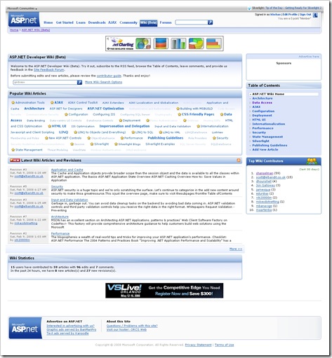 今天在瀏覽blog的時候看到一篇還蠻有趣的文章"ASP.NET Wiki"。越來越多人會在blog上寫一些技術文件,透過google雖然也會找到一些blog,但除了blog之外有可能再夾雜一點宣傳廣告、或是比較不相關的網頁。現在透過ASP.NET Wiki搜尋到的資料都是與ASP.net相關的,吻合度比較高。ASP.NET Wiki除了蒐集許多blog之外還有msdn的資料(從原文看來這很像是microsoft團隊開發的)。