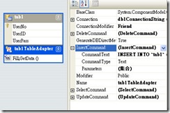 當資料庫連線建立之後TableAdapter會自動產生出來,且會自動把select、insert、update、delete等SQL語法建立起來,如果當程式對於datatable裡面的資料進行變動時,再呼叫TableAdapter.insert()、TableAdapter.update()...便可將資料回存到資料庫。